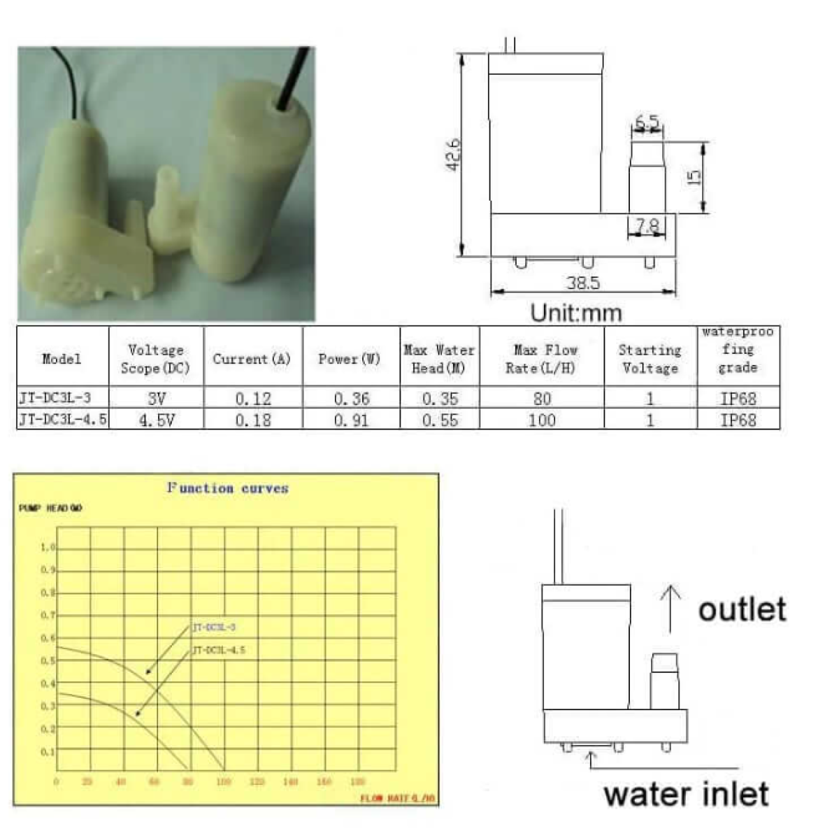 Bomba de agua Sumergible 3 a 5Vdc 1,2 a 1,6Ltr/mn vertial