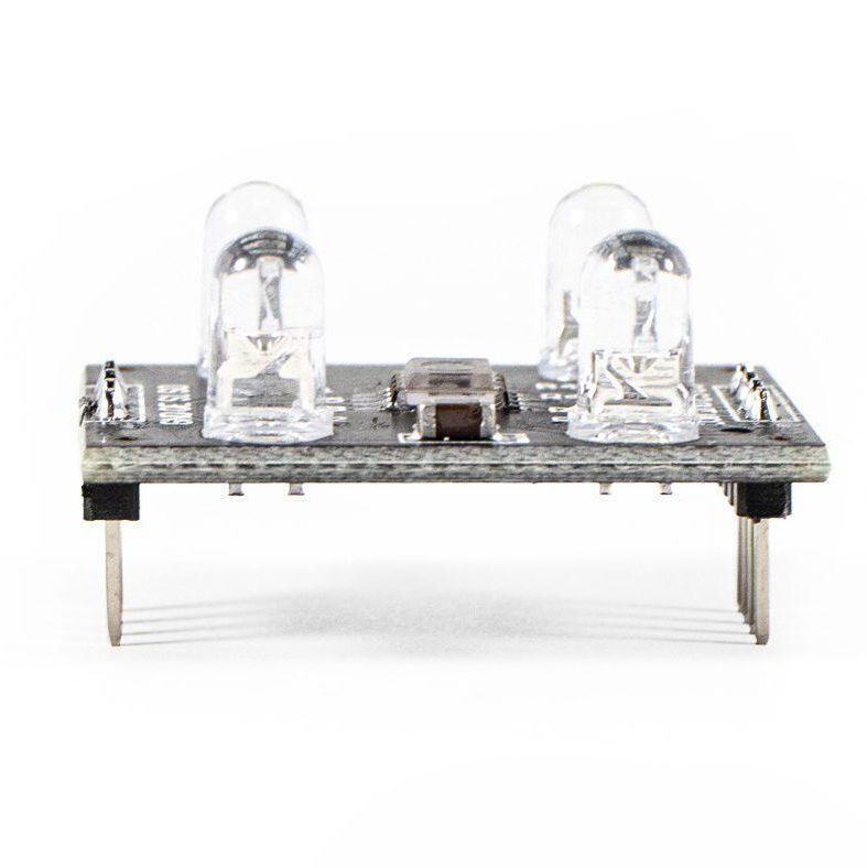 Este es un módulo que permite detectar una gran cantidad de colores visibles, incluye un sensor TCS230 y 4 Leds blancos de ángulo amplio. El sensor puede capturar datos RGB de una fuente de luz y los convierte en una señal cuadrada (50% ciclo de trabajo) en el pin de salida (out). El TCS230 tiene una matriz de diodos de 8 X 8, de los cuales 16 tienen filtro azul, 16 filtro verde, 16 filtro rojo y 16 sin filtro. Los filtros de cada color se distribuyen uniformemente a lo largo de la matriz para eliminar el sesgo de ubicación entre los colores. El dispositivo tiene un oscilador que produce una salida de onda cuadrada cuya frecuencia es proporcional a la intensidad del color elegido.