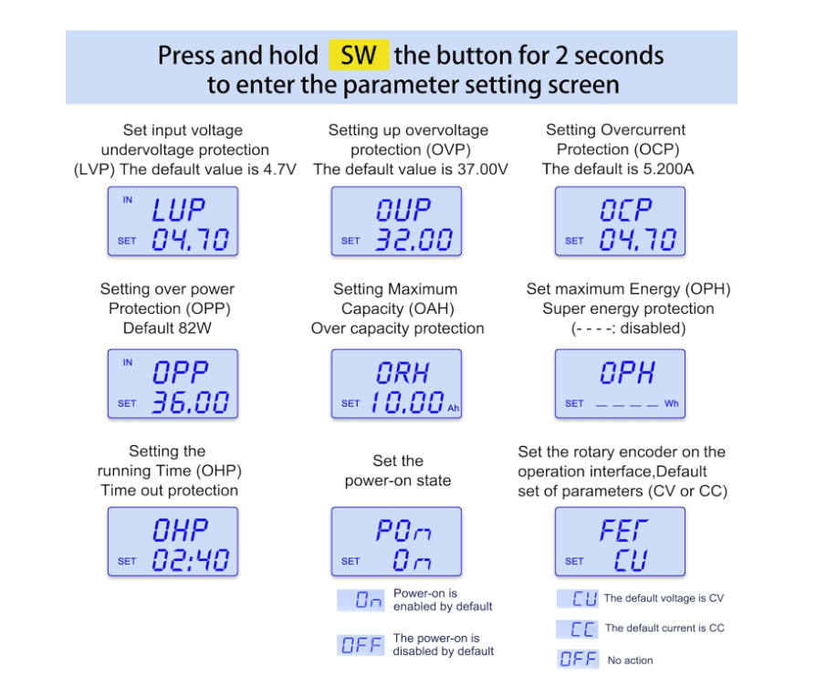- • Protección contra sobretensión de salida: Sí (0V-37V ajustable, predeterminado 37V)