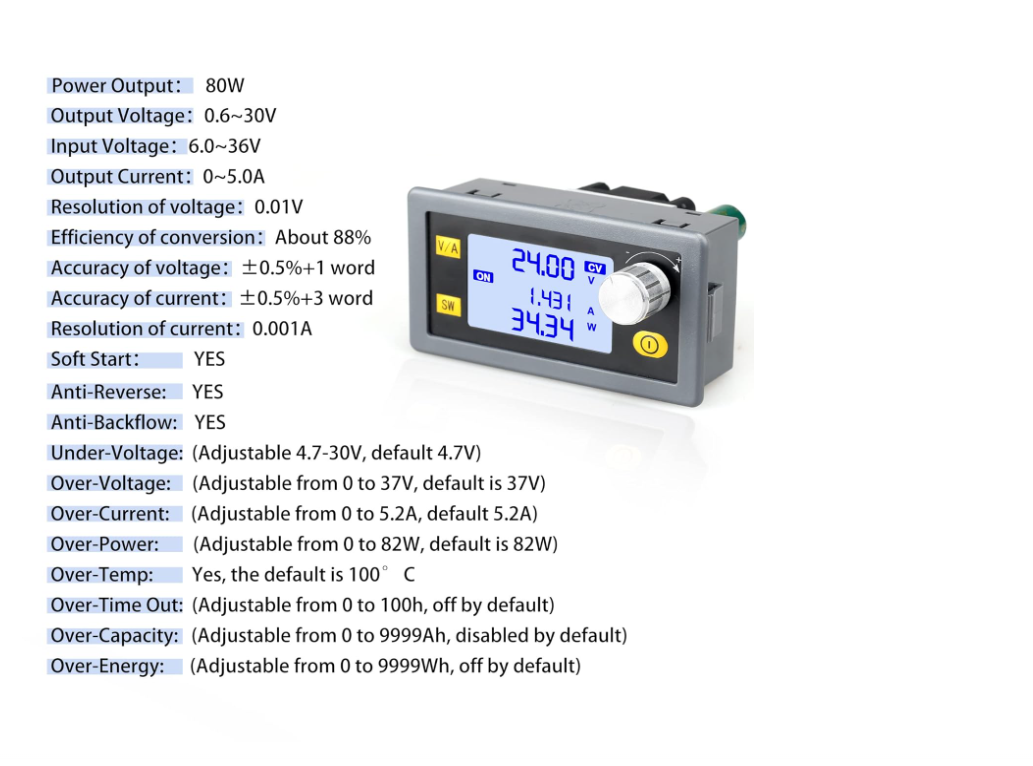 Parámetro del convertidor XY-SK80H Buck Boost: el rango de entrada de voltaje es CC 6.0-36V, el rango de voltaje de salida es CC 0.6-36V, la corriente máxima de salida es de 5 A, y la potencia máxima de salida es de 80 W